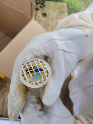 Leider ist mir bei dieser Arbeit auch ein Missgeschick passiert. Beim Versuch, eine Königin zu markieren, habe ich sie versehentlich verletzt, sodass sie das nicht überlebt hat.
